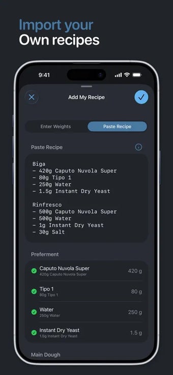 界面提供 三种复杂性级别——标准、高级和专家——以匹配您当前对面团的舒适程度。您可以轻松 加入预发酵,如 Biga 或 Poolish,甚至可以按特定比例混合多种类型的面粉,以实现独特的质地。由于该应用程序 支持公制和英制单位,无论您偏好使用哪种刻度或测量系统,它都能无缝工作。